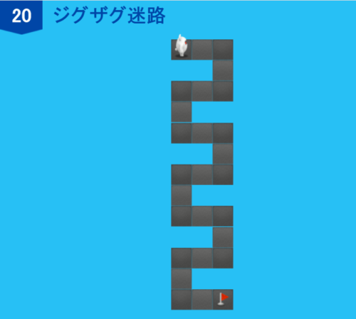 うまく繰り返し処理を使いたいですが、どの動作を繰り返したら良いでしょうか。先ほどの問題20の「ジグザグ迷路」でもありましたが、普通の矢印ブロックでの動作+一部繰り返し処理を使うという合わせ技でクリアしていくのがポイントです。